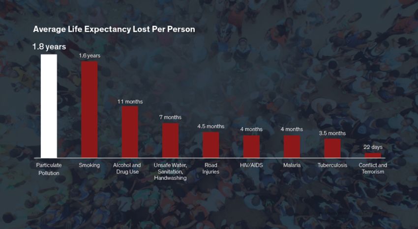 Ich möchte gerne auch noch ein wenig mehr zu Luftverschmutzung sagen. Luftverschmutzung wird mittlerweile als größter weltweiter Killer betrachtet. Durchschnittlich verkürzt sich die Lebenserwartung von uns allen um 1,8 Jahre.